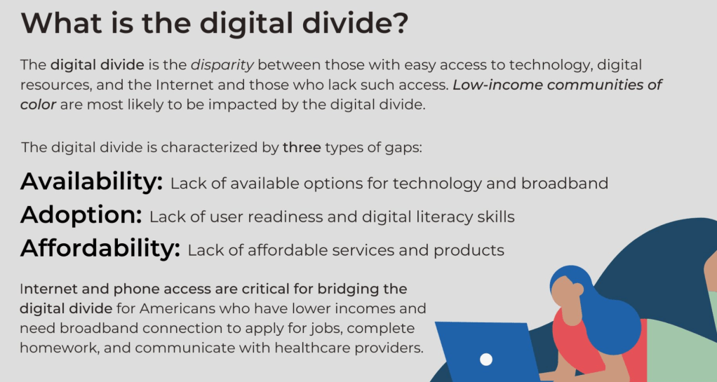 The digital divide is a term used to describe the gap between those who have access to digital technology and the internet and those who do not. This divide can affect generations and be influenced by a variety of factors. This can include socioeconomic status, geography, and education. As today’s society becomes more integrated with technology, the effects of the digital divide are more prominent. It presents significant challenges as the technologies, tools, and skills needed to participate in the digital world increase.
